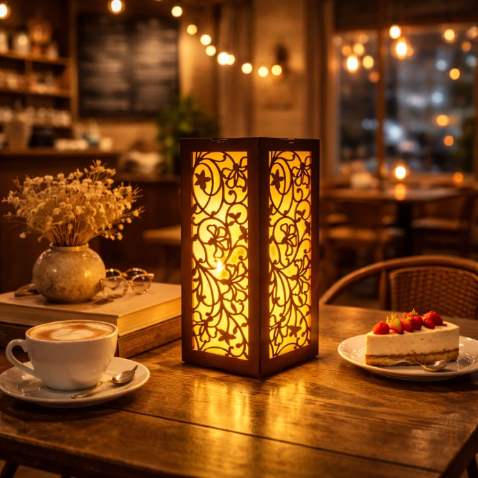 premium wooden decorative LED table lamp features an elegant laser-cut geometric pattern and warm white illumination. Powered by a safe 12V adapter with plug & play design, it is perfect for your space